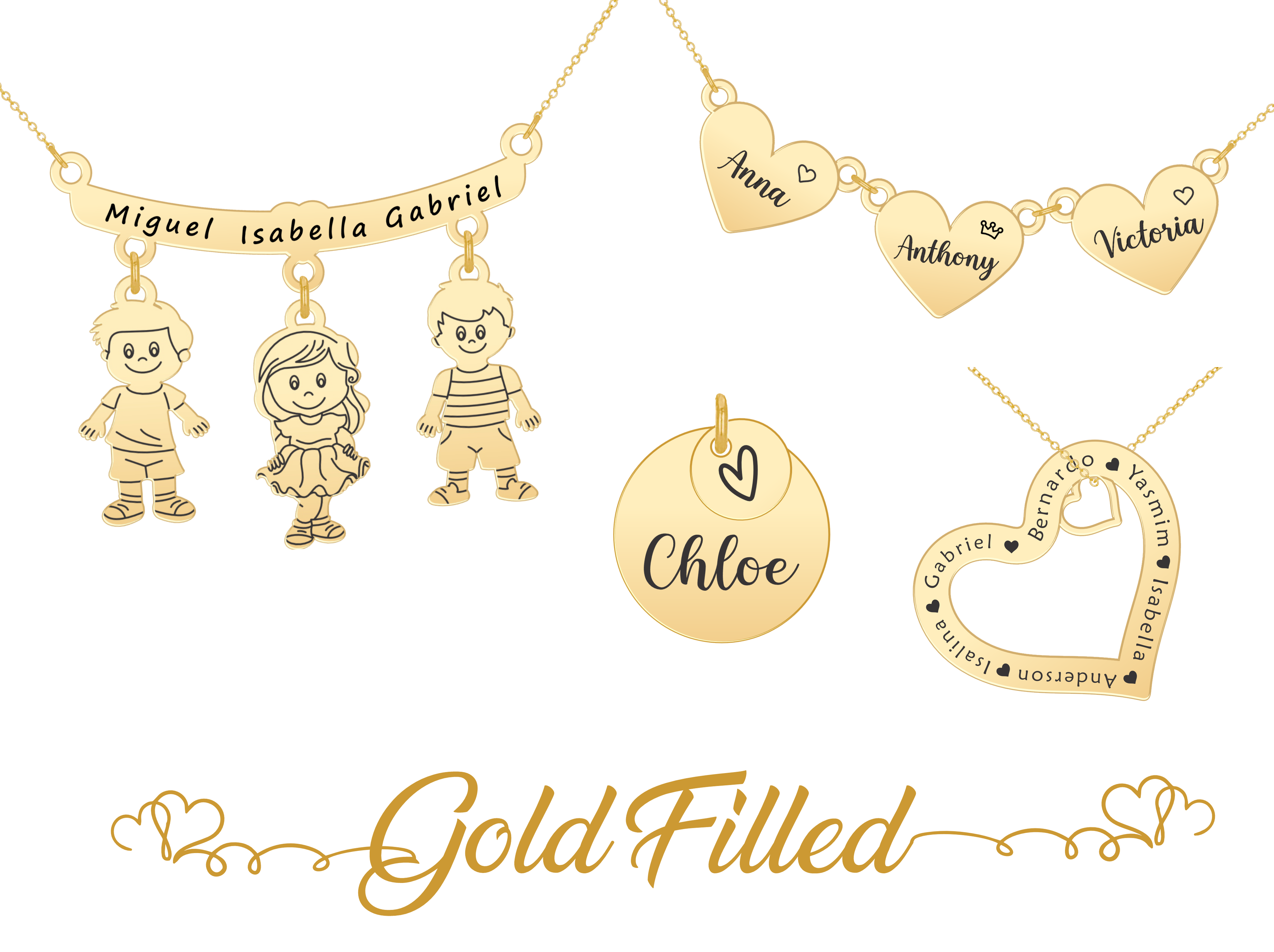 Custom heart necklace with family name, 14K gold filled